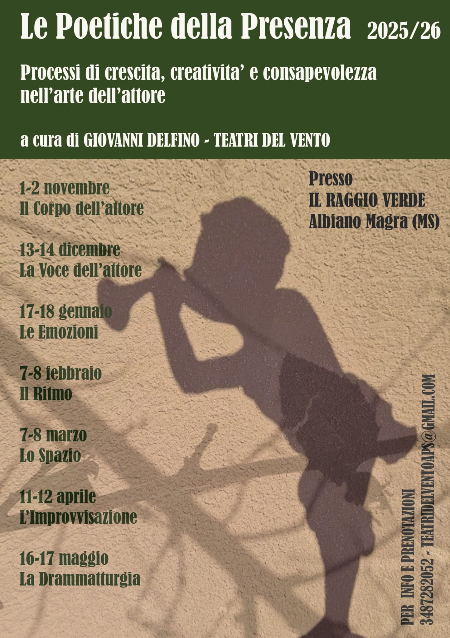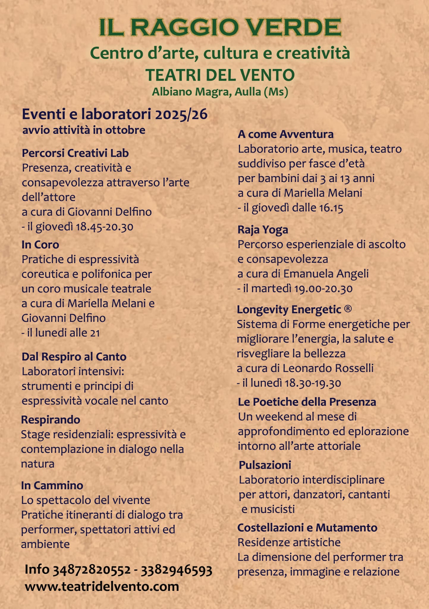Per info attività compagnia e gestione Raggio Verde contattare il 348.7282052 o il 338.2946593 oppure scrivere a teatridelventoaps@gmail.com